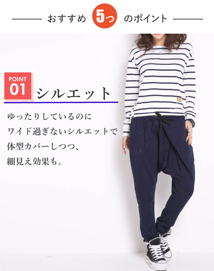 表記サイズ: フリー(ワンサイズ) *実寸サイズ記載 (単位:cm) 当店サイズ表記採寸方法詳細はこちら 実寸サイズ: 総丈:約85cm ウエスト:約62〜82cm ヒップ:約112cm 股上:前約37、後約41cm 股下:約47cm わたり幅:約52cm 裾幅:約13cm 素材: コットン100% 商品仕様 【伸縮性】あり 【透け感】なし 【裏地】なし *生産時期により多少異なる場合がございます。